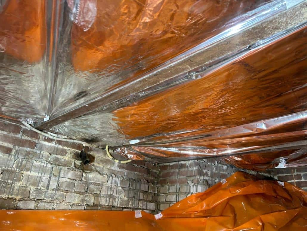 Als eerste fase hebben we voor het optrekkend vocht uit de bodem een laag noppenfolie aangebracht. De tweede fase in deze aanpak bestond uit het aanbrengen van TONZON bodemfolie. De bodemfolie werd over de gehele vloer aangebracht met een hoog opstaande rand tegen de muren. Deze werd machinaal bevestigd zodat we zeker weten dat de folie vastzit. Hierdoor krijgt optrekkend vocht vanuit de bodem geen kans meer.