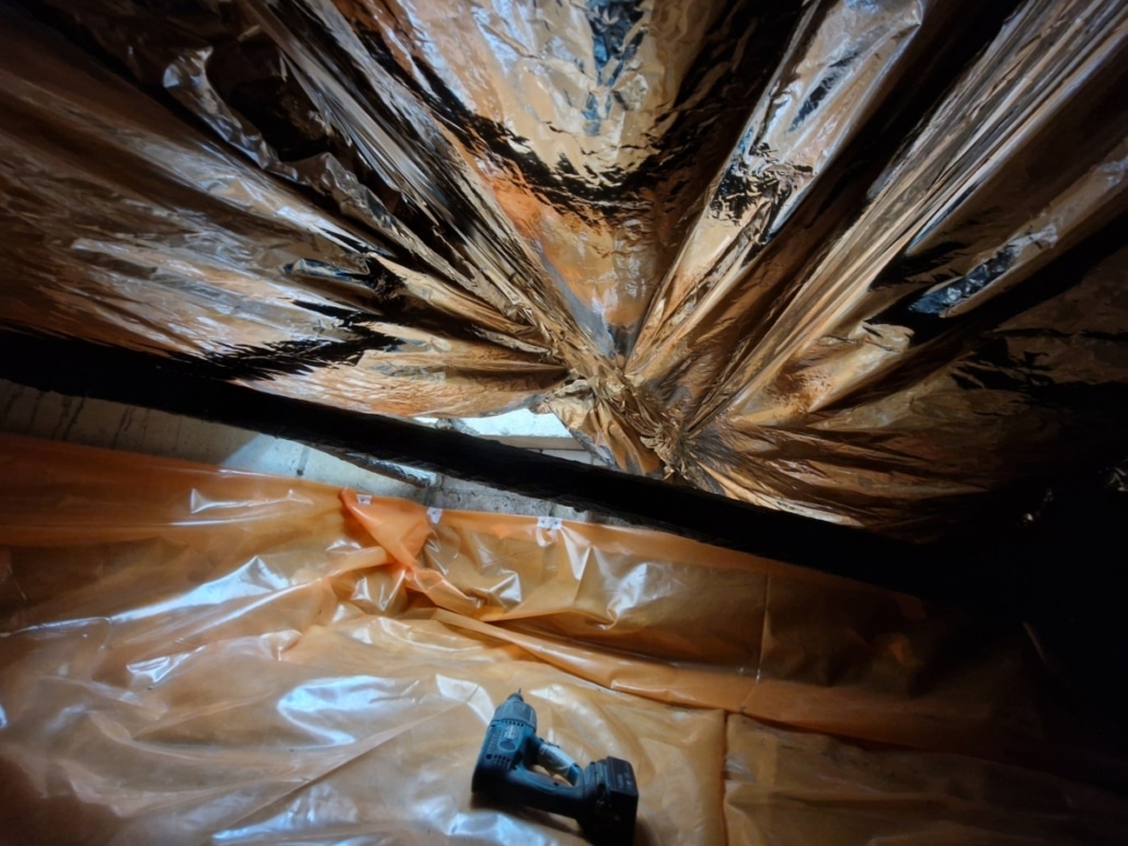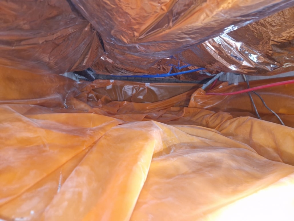 Als eerste fase hebben we voor het optrekkend vocht uit de bodem een laag noppenfolie aangebracht. De tweede fase in deze aanpak bestond uit het aanbrengen van TONZON bodemfolie. De bodemfolie werd over de gehele vloer aangebracht met een hoog opstaande rand tegen de muren. Deze werd machinaal bevestigd zodat we zeker weten dat de folie vastzit. Hierdoor krijgt optrekkend vocht vanuit de bodem geen kans meer.