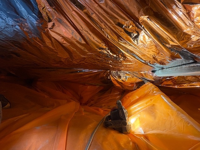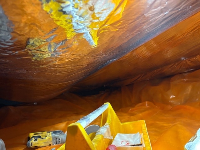 Als eerste fase hebben we voor het optrekkend vocht uit de bodem een laag noppenfolie aangebracht. De tweede fase in deze aanpak bestond uit het aanbrengen van TONZON bodemfolie. De bodemfolie werd over de gehele vloer aangebracht met een hoog opstaande rand tegen de muren. Deze werd machinaal bevestigd zodat we zeker weten dat de folie vastzit. Hierdoor krijgt optrekkend vocht vanuit de bodem geen kans meer.