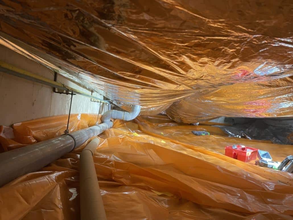 Als eerste fase hebben we voor het optrekkend vocht uit de bodem een laag noppenfolie aangebracht. De tweede fase in deze aanpak bestond uit het aanbrengen van TONZON bodemfolie. De bodemfolie werd over de gehele vloer aangebracht met een hoog opstaande rand tegen de muren. Deze werd machinaal bevestigd zodat we zeker weten dat de folie vastzit. Hierdoor krijgt optrekkend vocht vanuit de bodem geen kans meer.