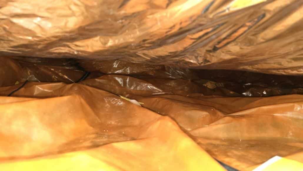 Als eerste fase hebben we voor het optrekkend vocht uit de bodem een laag noppenfolie aangebracht. De tweede fase in deze aanpak bestond uit het aanbrengen van TONZON bodemfolie. De bodemfolie werd over de gehele vloer aangebracht met een hoog opstaande rand tegen de muren. Deze werd machinaal bevestigd zodat we zeker weten dat de folie vastzit. Hierdoor krijgt optrekkend vocht vanuit de bodem geen kans meer.