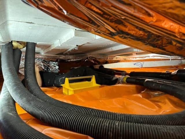 Ventilatievoorzieningen: Nee | Wateroverlast: Soms | Leidingen: Hinderlijk | Soort bodem: Klei | Soort vloer: Piepschuim | Kwaliteit beton: Goed | Isolatie aanwezig: Nee | Doorgang aanwezig: Nee | Puin aanwezig: Nee | Onderkant vloer droog: Nee | Houtwormen: Nee | Uitvoering: Gemiddeld | Vloer tussen/dwars: Nvt | Graven: nvt | Uur: Nee | Aantal personen: Nee | Beschrijving: Nee In deze kruipruimte was de onderkant van de vloer niet droog. Als de onderkant van de vloer in de kruipruimte vochtig is, brengen we als eerst TONZON bodemfolie aan. Met bodemfolie kan de vloer goed indrogen. Toen de vloer in deze kruipruimte droog genoeg was, konden we beginnen met het isoleren van de kruipruimte. We hebben deze bewoners aangeraden om naast kruipruimte isolatie ook ventilatie toe te passen. Zoals ze nu hebben gezien, is de kans op vocht in hun kruipruimte groot. Dit voorkom je in de toekomst met voldoende kruipruimte ventilatie. Alles in deze ruimte moet in de juiste verhouding zijn, om een zo optimaal mogelijk rendement te bereiken.