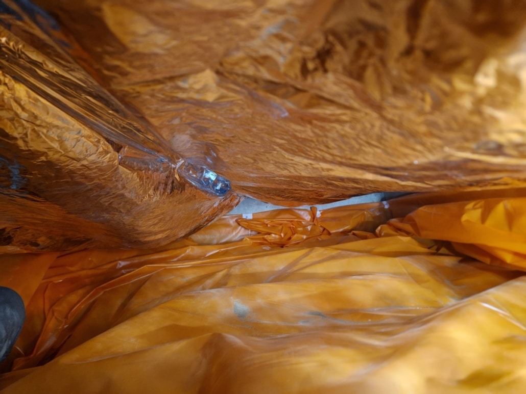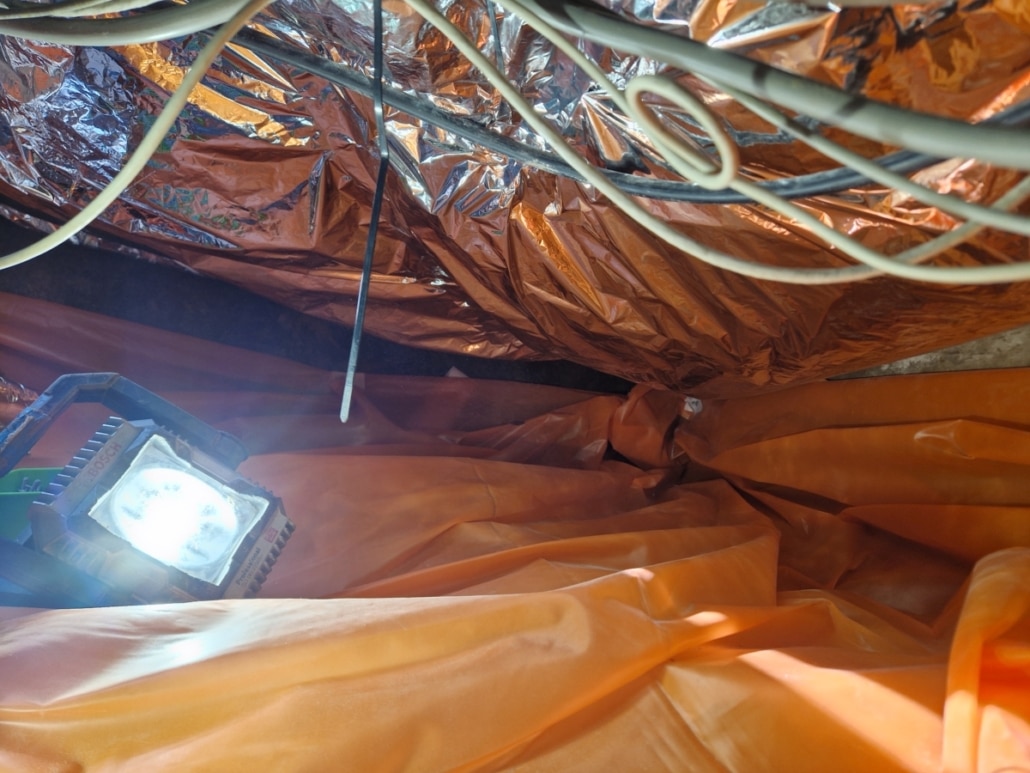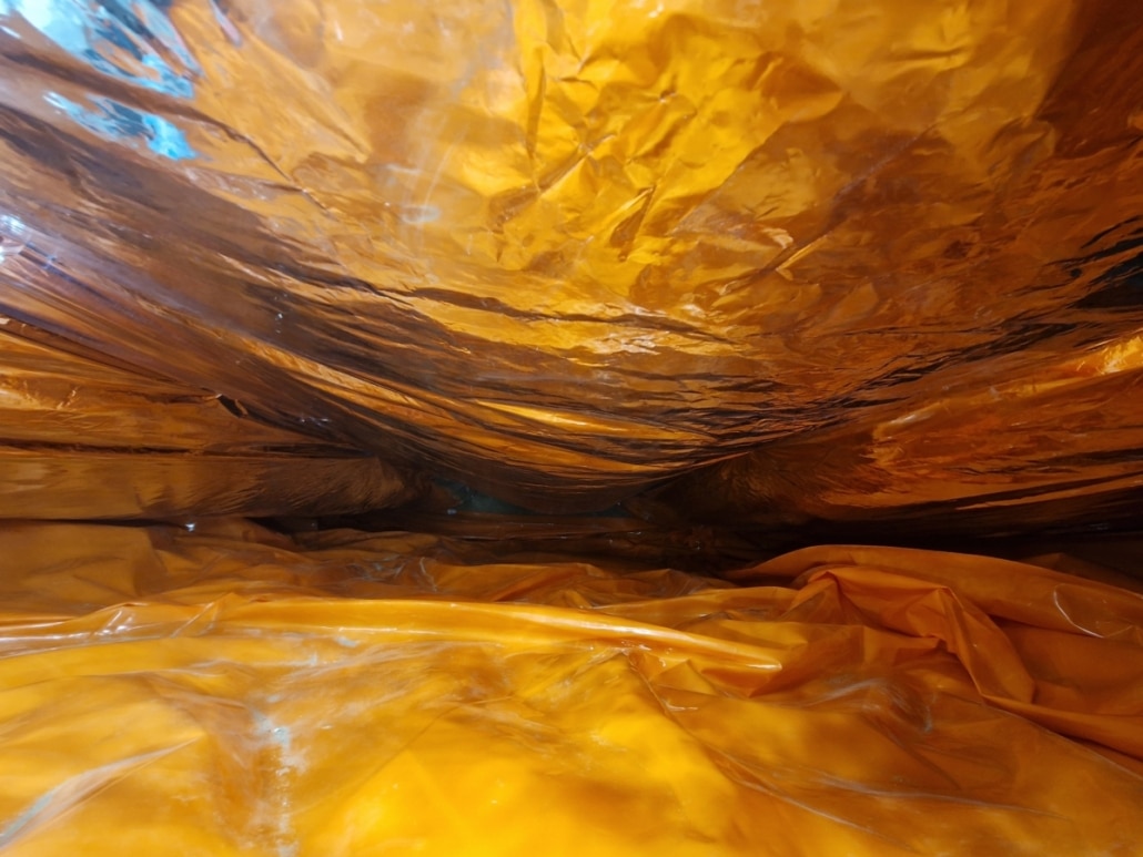 Als eerste fase hebben we voor het optrekkend vocht uit de bodem een laag noppenfolie aangebracht. De tweede fase in deze aanpak bestond uit het aanbrengen van TONZON bodemfolie. De bodemfolie werd over de gehele vloer aangebracht met een hoog opstaande rand tegen de muren. Deze werd machinaal bevestigd zodat we zeker weten dat de folie vastzit. Hierdoor krijgt optrekkend vocht vanuit de bodem geen kans meer.
