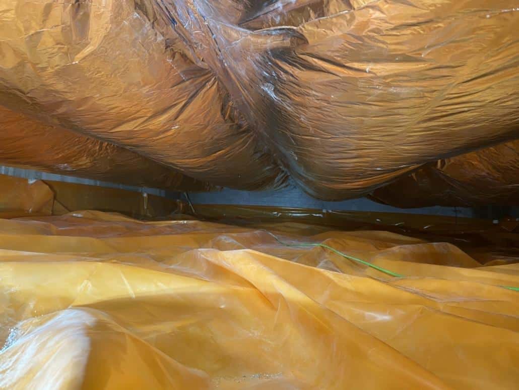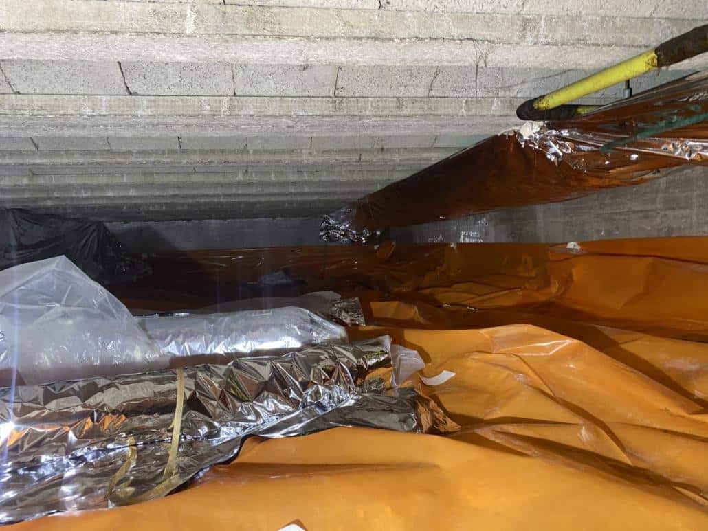 Als eerste fase hebben we voor het optrekkend vocht uit de bodem een laag noppenfolie aangebracht. De tweede fase in deze aanpak bestond uit het aanbrengen van TONZON bodemfolie. De bodemfolie werd over de gehele vloer aangebracht met een hoog opstaande rand tegen de muren. Deze werd machinaal bevestigd zodat we zeker weten dat de folie vastzit. Hierdoor krijgt optrekkend vocht vanuit de bodem geen kans meer.
