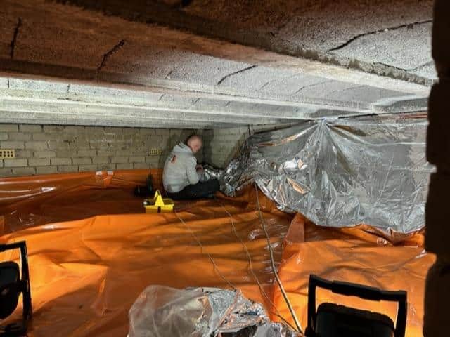 Als eerste fase hebben we voor het optrekkend vocht uit de bodem een laag noppenfolie aangebracht. De tweede fase in deze aanpak bestond uit het aanbrengen van TONZON bodemfolie. De bodemfolie werd over de gehele vloer aangebracht met een hoog opstaande rand tegen de muren. Deze werd machinaal bevestigd zodat we zeker weten dat de folie vastzit. Hierdoor krijgt optrekkend vocht vanuit de bodem geen kans meer.