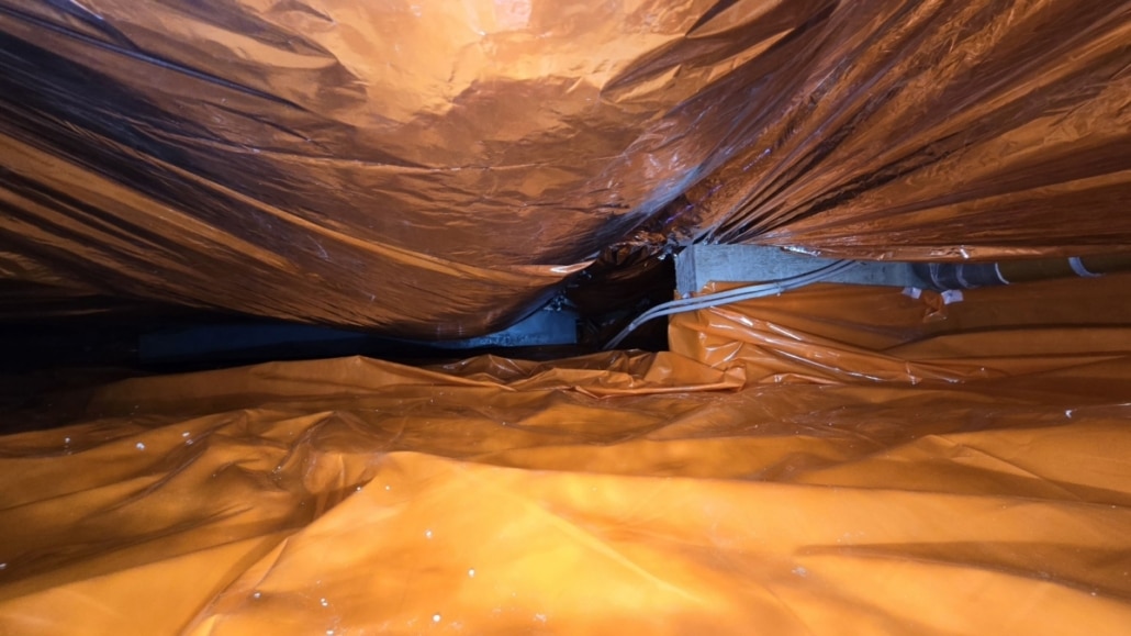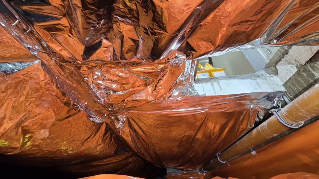 Als eerste fase hebben we voor het optrekkend vocht uit de bodem een laag noppenfolie aangebracht. De tweede fase in deze aanpak bestond uit het aanbrengen van TONZON bodemfolie. De bodemfolie werd over de gehele vloer aangebracht met een hoog opstaande rand tegen de muren. Deze werd machinaal bevestigd zodat we zeker weten dat de folie vastzit. Hierdoor krijgt optrekkend vocht vanuit de bodem geen kans meer.