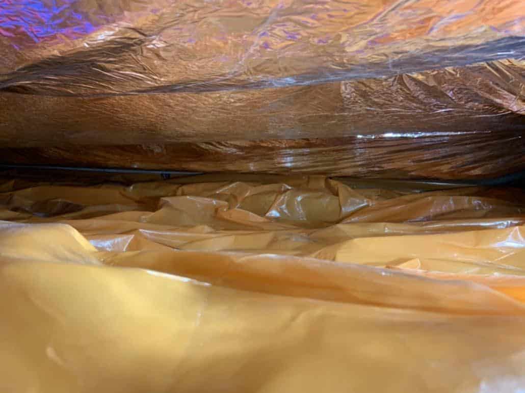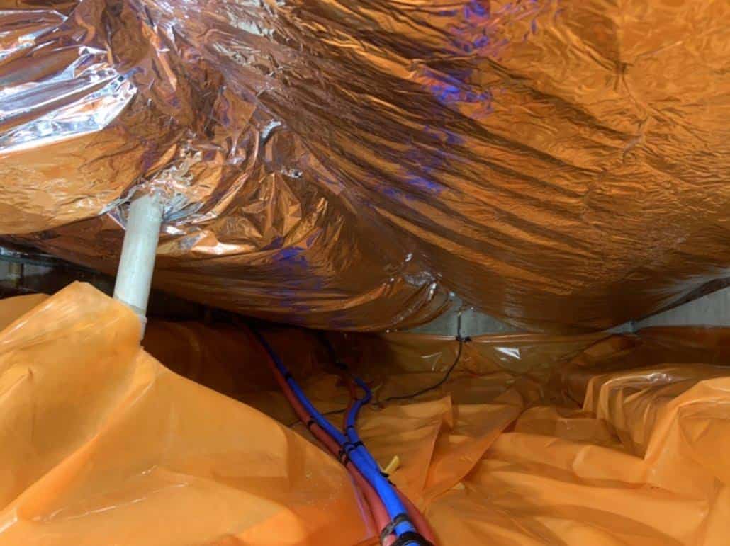 Als eerste fase hebben we voor het optrekkend vocht uit de bodem een laag noppenfolie aangebracht. De tweede fase in deze aanpak bestond uit het aanbrengen van TONZON bodemfolie. De bodemfolie werd over de gehele vloer aangebracht met een hoog opstaande rand tegen de muren. Deze werd machinaal bevestigd zodat we zeker weten dat de folie vastzit. Hierdoor krijgt optrekkend vocht vanuit de bodem geen kans meer.
