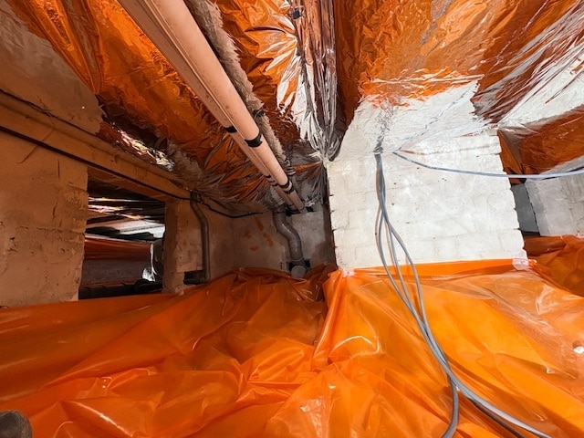 Als eerste fase hebben we voor het optrekkend vocht uit de bodem een laag noppenfolie aangebracht. De tweede fase in deze aanpak bestond uit het aanbrengen van TONZON bodemfolie. De bodemfolie werd over de gehele vloer aangebracht met een hoog opstaande rand tegen de muren. Deze werd machinaal bevestigd zodat we zeker weten dat de folie vastzit. Hierdoor krijgt optrekkend vocht vanuit de bodem geen kans meer.