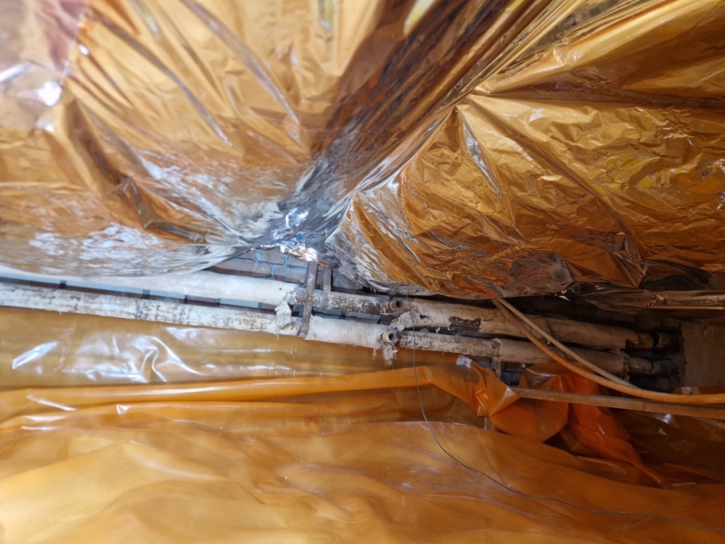 Als eerste fase hebben we voor het optrekkend vocht uit de bodem een laag noppenfolie aangebracht. De tweede fase in deze aanpak bestond uit het aanbrengen van TONZON bodemfolie. De bodemfolie werd over de gehele vloer aangebracht met een hoog opstaande rand tegen de muren. Deze werd machinaal bevestigd zodat we zeker weten dat de folie vastzit. Hierdoor krijgt optrekkend vocht vanuit de bodem geen kans meer.