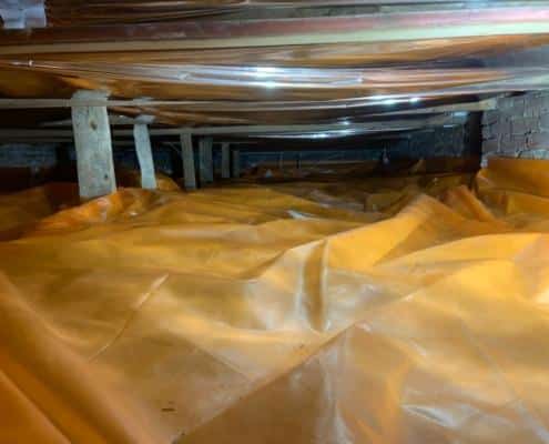 Als eerste fase hebben we voor het optrekkend vocht uit de bodem een laag noppenfolie aangebracht. De tweede fase in deze aanpak bestond uit het aanbrengen van TONZON bodemfolie. De bodemfolie werd over de gehele vloer aangebracht met een hoog opstaande rand tegen de muren. Deze werd machinaal bevestigd zodat we zeker weten dat de folie vastzit. Hierdoor krijgt optrekkend vocht vanuit de bodem geen kans meer.