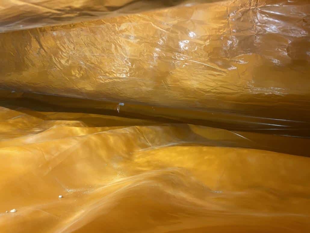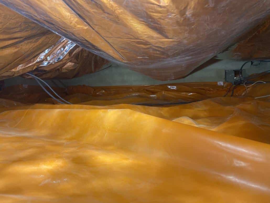 Als eerste fase hebben we voor het optrekkend vocht uit de bodem een laag noppenfolie aangebracht. De tweede fase in deze aanpak bestond uit het aanbrengen van TONZON bodemfolie. De bodemfolie werd over de gehele vloer aangebracht met een hoog opstaande rand tegen de muren. Deze werd machinaal bevestigd zodat we zeker weten dat de folie vastzit. Hierdoor krijgt optrekkend vocht vanuit de bodem geen kans meer.