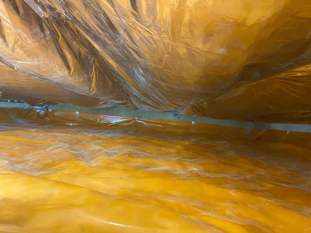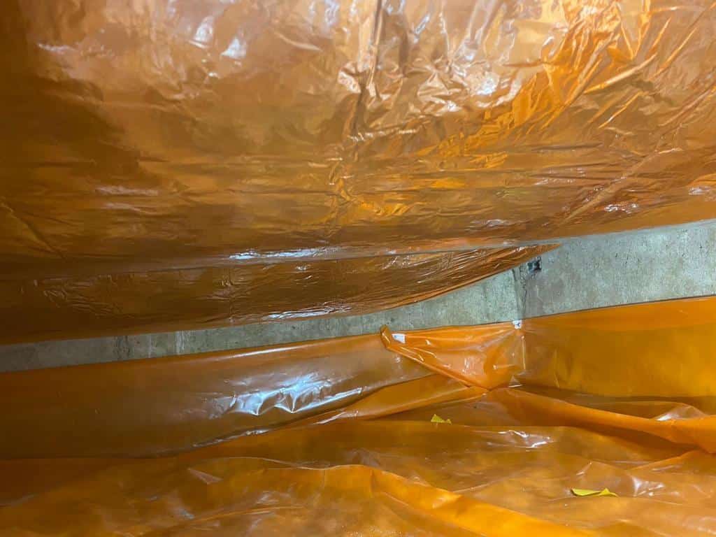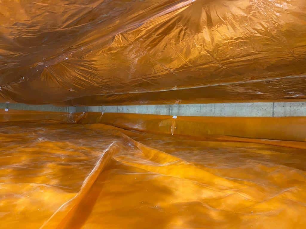 Deze bewoners hebben een betonnen broodjesvloer in hun woning. Vaak zien wij dat veel niet-geïsoleerde betonnen broodjesvloeren vochtig zijn. Vooral als de vloerbekleding aan de bovenzijde niet doorlatende vloerbedekking, zeil of een dichte ondergrond kent, zoals bij laminaat of andere afdekking. Hierdoor kan betonrot versneld optreden en op langere termijn voor vervelende consequenties zorgen. Voor het drogen van de kruipruimte brengen we de TONZON bodemfolie aan, zodat de vloer goed kan indrogen.