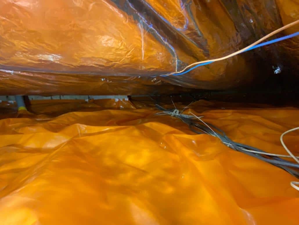 Als eerste fase hebben we voor het optrekkend vocht uit de bodem een laag noppenfolie aangebracht. De tweede fase in deze aanpak bestond uit het aanbrengen van TONZON bodemfolie. De bodemfolie werd over de gehele vloer aangebracht met een hoog opstaande rand tegen de muren. Deze werd machinaal bevestigd zodat we zeker weten dat de folie vastzit. Hierdoor krijgt optrekkend vocht vanuit de bodem geen kans meer.