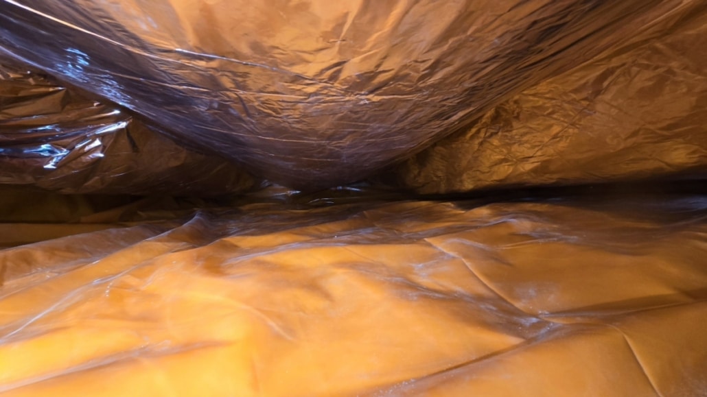 Als eerste fase hebben we voor het optrekkend vocht uit de bodem een laag noppenfolie aangebracht. De tweede fase in deze aanpak bestond uit het aanbrengen van TONZON bodemfolie. De bodemfolie werd over de gehele vloer aangebracht met een hoog opstaande rand tegen de muren. Deze werd machinaal bevestigd zodat we zeker weten dat de folie vastzit. Hierdoor krijgt optrekkend vocht vanuit de bodem geen kans meer.