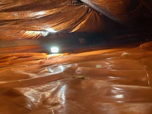 - Bodemfolie: vervolgens hebben we bodemfolie aangebracht op de bodem van de kruipruimte. Dit zorgt ervoor dat vocht vanuit de bodem geen kans krijgt om zich verder te ontwikkelen. We pakken hierbij de gehele bodem mee, maar ook de onderkant van de muren.