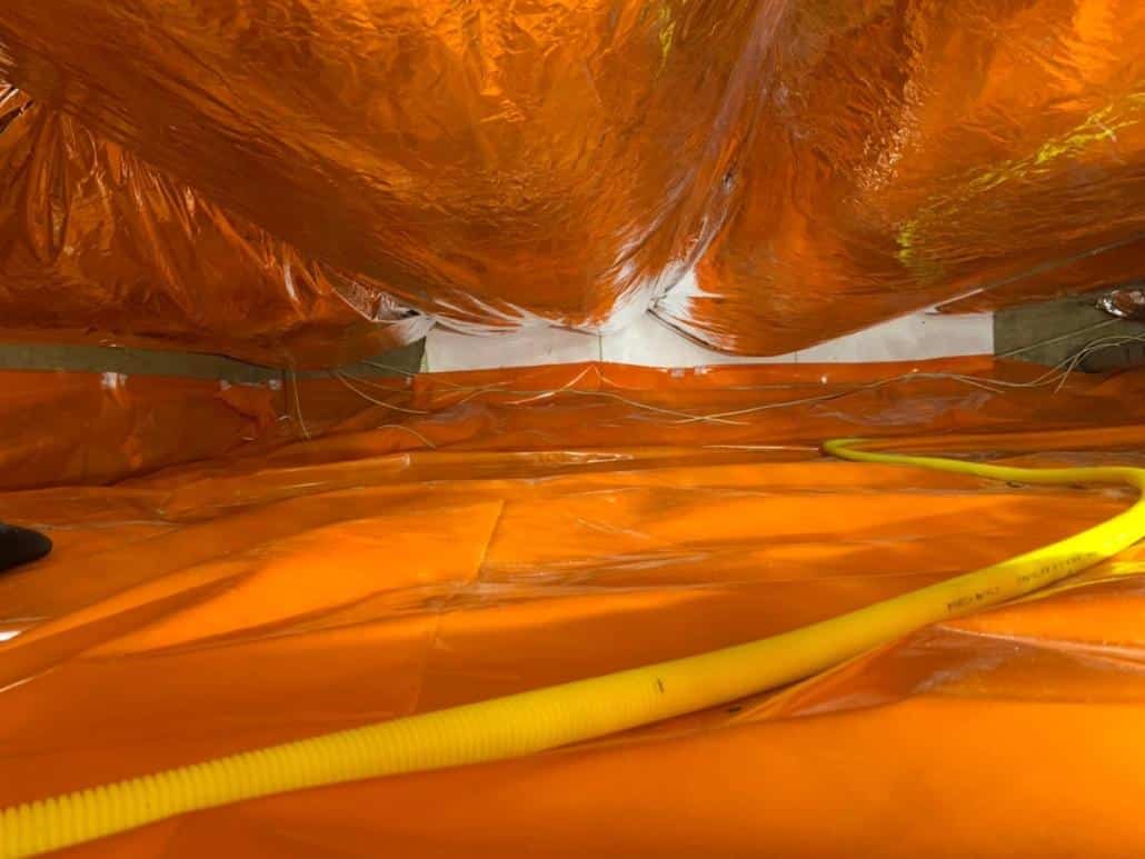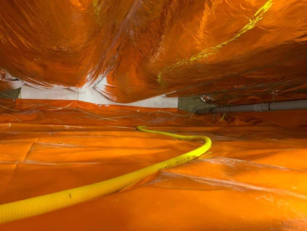 TONZON vloerisolatie kent een tweeledige aanpak. Bij deze klant uit Delft hebben we bodemfolie en thermokussens aangebracht. De bodemfolie werd over de gehele vloer aangebracht met een hoog opstaande rand tegen de muren in de kruipruimte. De bodemfolie werd machinaal bevestigd, zodat we zeker weten dat de folie vastzit. Hierdoor krijgt optrekkend vocht vanuit de bodem geen kans meer. Naast bodemfolie hebben we ook thermokussens gebruikt om de isolatie van de kruipruimte zo maximaal mogelijk te maken. Thermokussens worden in de vorm van luchtzakken tegen de onderzijde van de vloer aangebracht. De luchtzakken zorgen ervoor dat warme lucht die door de vloer naar beneden komt, teruggekaatst wordt naar boven. Hierdoor blijft de vloer beter op temperatuur, waardoor er minder warmteverlies ontstaat en de stookkosten dalen.