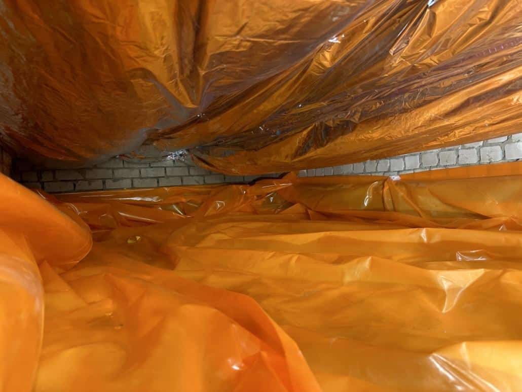 • Bodemfolie: hierdoor krijgt optrekkend vocht vanuit de bodem geen kans. Bodemfolie wordt over de gehele bodem aangebracht met een hoog opstaande rand tegen de muren. Dit wordt machinaal bevestigd, zodat het goed vastzit.