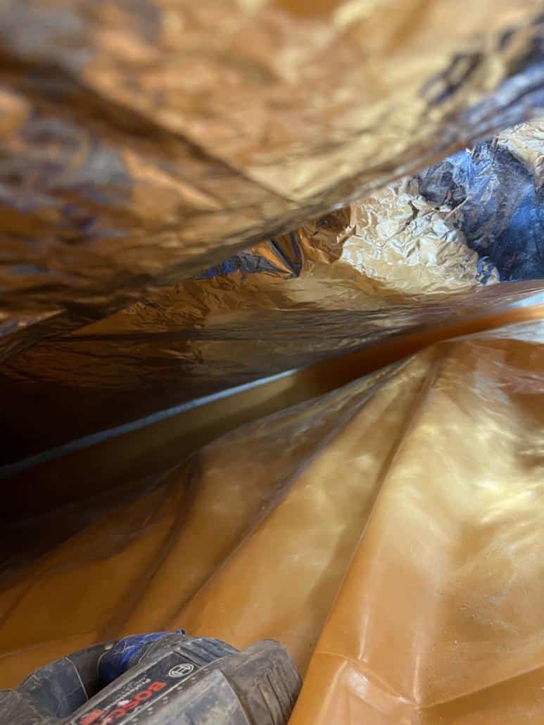 TONZON vloerisolatie kent een tweeledige aanpak. Bij deze klant uit Oud-Beijerland hebben we bodemfolie en thermokussens aangebracht. De bodemfolie werd over de gehele vloer aangebracht met een hoog opstaande rand tegen de muren in de kruipruimte. De bodemfolie werd machinaal bevestigd, zodat we zeker weten dat de folie vastzit. Hierdoor krijgt optrekkend vocht vanuit de bodem geen kans meer. Naast bodemfolie hebben we ook thermokussens gebruikt om de isolatie van de kruipruimte zo maximaal mogelijk te maken. Thermokussens worden in de vorm van luchtzakken tegen de onderzijde van de vloer aangebracht. De luchtzakken zorgen ervoor dat warme lucht die door de vloer naar beneden komt, teruggekaatst wordt naar boven. Hierdoor blijft de vloer beter op temperatuur, waardoor er minder warmteverlies ontstaat en de stookkosten dalen.