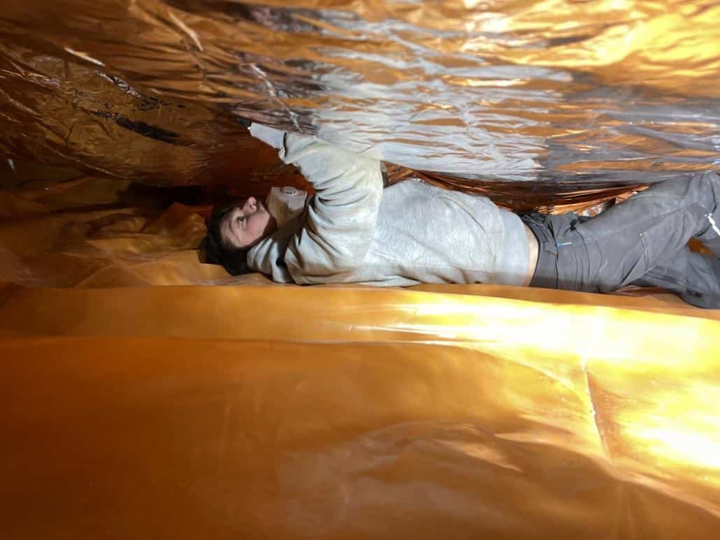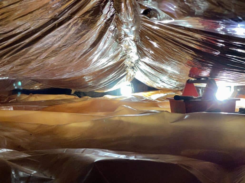 Als eerste fase hebben we voor het optrekkend vocht uit de bodem een laag noppenfolie aangebracht. De tweede fase in deze aanpak bestond uit het aanbrengen van TONZON bodemfolie. De bodemfolie werd over de gehele vloer aangebracht met een hoog opstaande rand tegen de muren. Deze werd machinaal bevestigd zodat we zeker weten dat de folie vastzit. Hierdoor krijgt optrekkend vocht vanuit de bodem geen kans meer.