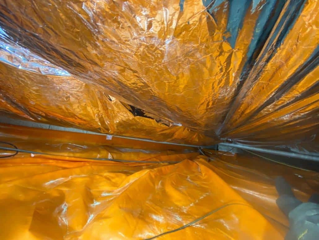 Als eerste fase hebben we voor het optrekkend vocht uit de bodem een laag noppenfolie aangebracht. De tweede fase in deze aanpak bestond uit het aanbrengen van TONZON bodemfolie. De bodemfolie werd over de gehele vloer aangebracht met een hoog opstaande rand tegen de muren. Deze werd machinaal bevestigd zodat we zeker weten dat de folie vastzit. Hierdoor krijgt optrekkend vocht vanuit de bodem geen kans meer.