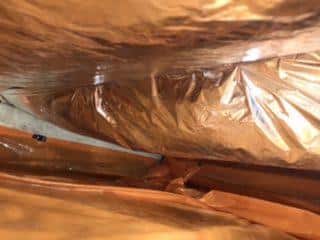 TONZON vloerisolatie kent een tweeledige aanpak. Na de bodemfolie te hebben aangebracht kon de vloer worden aangepakt. Hiervoor maakten we gebruik van de zogenoemde thermokussens. Deze folie wordt in de vorm van luchtzakken tegen de onderzijde van de vloer aangebracht. De luchtzakken zorgen ervoor dat warme lucht die door de vloer naar beneden komt teruggekaatst wordt naar boven. Hierdoor blijft de vloer beter op temperatuur, waardoor minder warmte verlies en dus lagere stookkosten. Daarmee hebben we het probleem van de koude vloer aangepakt!