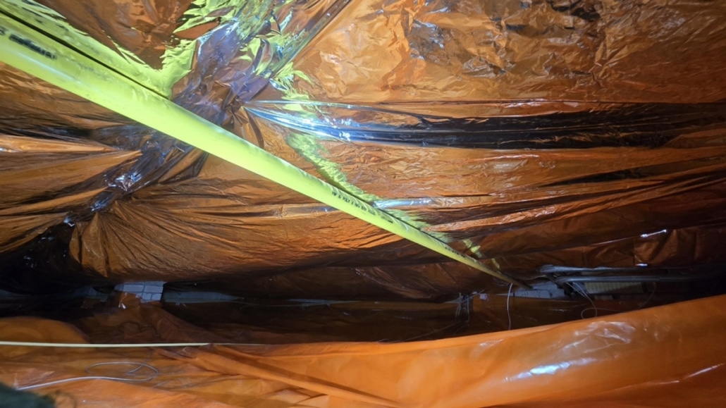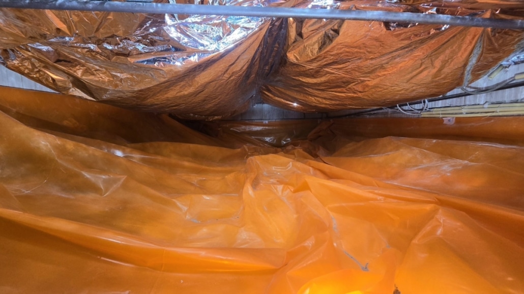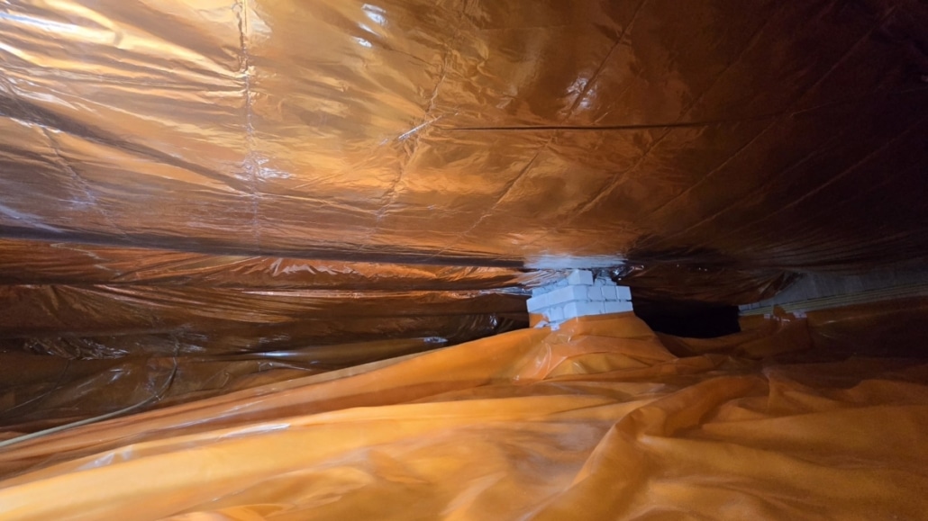 Als eerste fase hebben we voor het optrekkend vocht uit de bodem een laag noppenfolie aangebracht. De tweede fase in deze aanpak bestond uit het aanbrengen van TONZON bodemfolie. De bodemfolie werd over de gehele vloer aangebracht met een hoog opstaande rand tegen de muren. Deze werd machinaal bevestigd zodat we zeker weten dat de folie vastzit. Hierdoor krijgt optrekkend vocht vanuit de bodem geen kans meer.