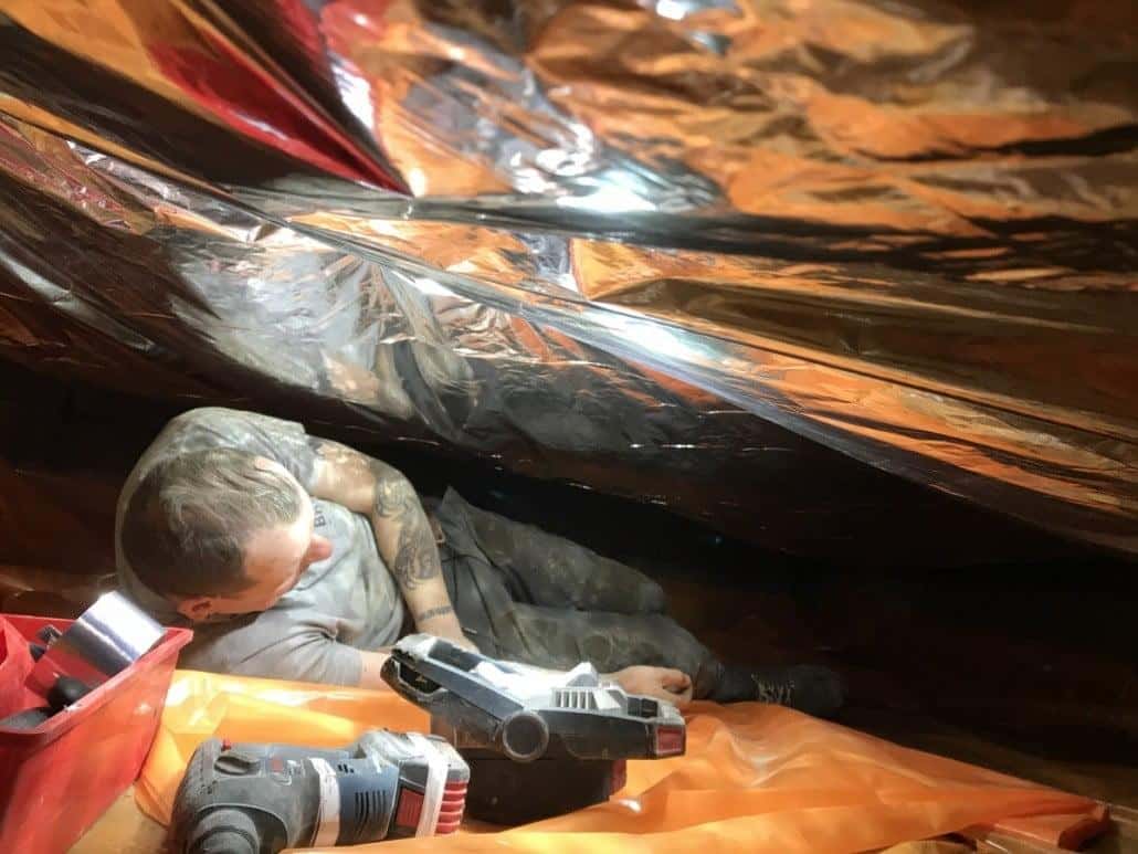 In de eerste fase hebben we voor het optrekkend vocht uit de bodem een laag noppenfolie aangebracht. De tweede fase in deze aanpak bestond uit het aanbrengen van TONZON bodemfolie. De bodemfolie werd over de gehele vloer aangebracht met een hoog opstaande rand tegen de muren. Deze werd machinaal bevestigd, zodat we zeker weten dat de folie vastzit. Hierdoor krijgt optrekkend vocht vanuit de bodem geen kans meer.