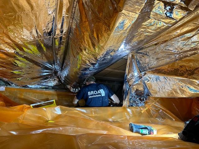 Als eerste fase hebben we voor het optrekkend vocht uit de bodem een laag noppenfolie aangebracht. De tweede fase in deze aanpak bestond uit het aanbrengen van TONZON bodemfolie. De bodemfolie werd over de gehele vloer aangebracht met een hoog opstaande rand tegen de muren. Deze werd machinaal bevestigd zodat we zeker weten dat de folie vastzit. Hierdoor krijgt optrekkend vocht vanuit de bodem geen kans meer.