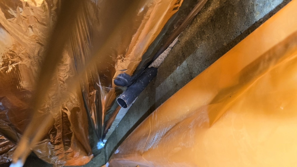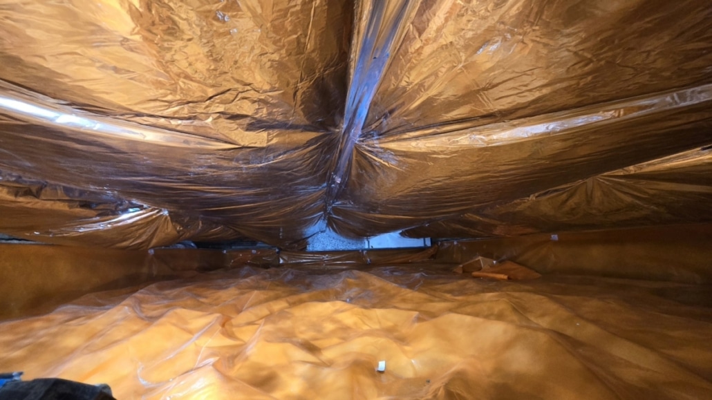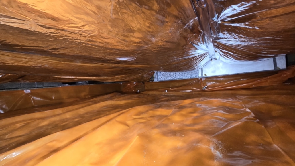 Als eerste fase hebben we voor het optrekkend vocht uit de bodem een laag noppenfolie aangebracht. De tweede fase in deze aanpak bestond uit het aanbrengen van TONZON bodemfolie. De bodemfolie werd over de gehele vloer aangebracht met een hoog opstaande rand tegen de muren. Deze werd machinaal bevestigd zodat we zeker weten dat de folie vastzit. Hierdoor krijgt optrekkend vocht vanuit de bodem geen kans meer.