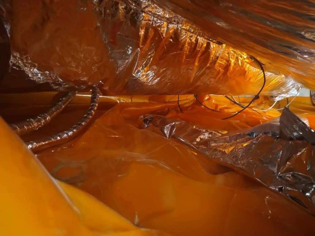 TONZON vloerisolatie kent een tweeledige aanpak. Na de bodemfolie te hebben aangebracht kon de vloer worden aangepakt. Hiervoor maken we gebruik van de zogenoemde thermokussens. Deze folie wordt in de vorm van luchtzakken tegen de onderzijde van de vloer aangebracht. De luchtzakken zorgen ervoor dat warme lucht die door de vloer naar beneden komt teruggekaatst wordt naar boven. Hierdoor blijft de vloer beter op temperatuur, waardoor minder warmte verlies en dus lagere stookkosten. Daarmee hebben we het probleem van de koude vloer aangepakt en zorgen we ervoor dat er minder warmte verlies is en dus lagere stookkosten in de wintermaanden.