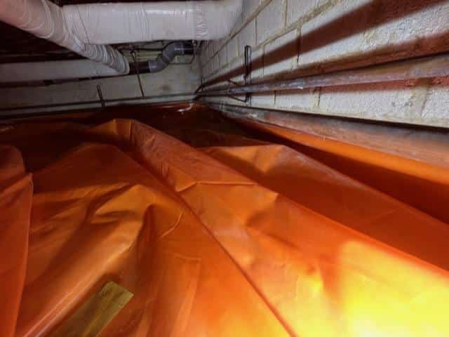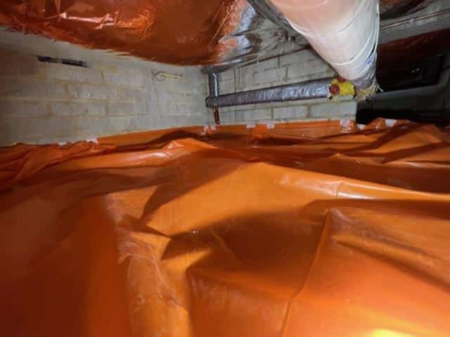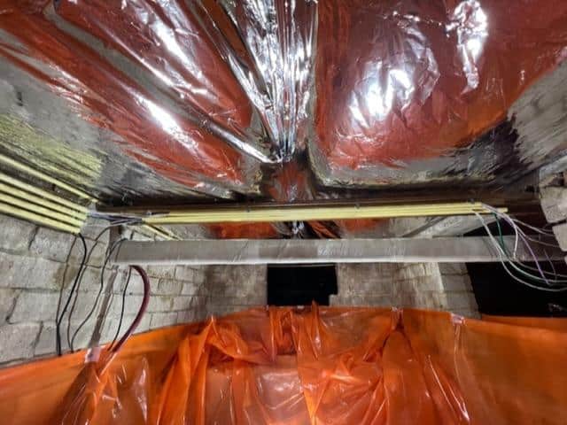 Als eerste fase hebben we voor het optrekkend vocht uit de bodem een laag noppenfolie aangebracht. De tweede fase in deze aanpak bestond uit het aanbrengen van TONZON bodemfolie. De bodemfolie werd over de gehele vloer aangebracht met een hoog opstaande rand tegen de muren. Deze werd machinaal bevestigd zodat we zeker weten dat de folie vastzit. Hierdoor krijgt optrekkend vocht vanuit de bodem geen kans meer.