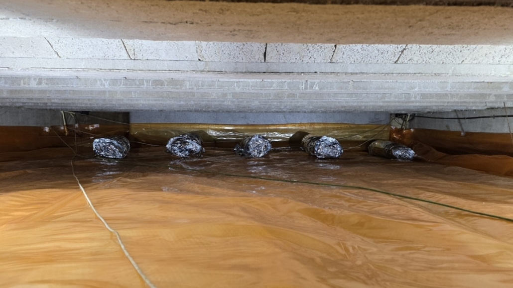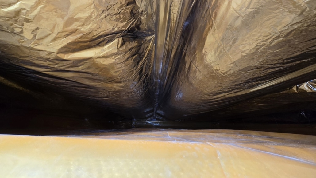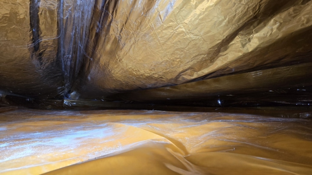 Als eerste fase hebben we voor het optrekkend vocht uit de bodem een laag noppenfolie aangebracht. De tweede fase in deze aanpak bestond uit het aanbrengen van TONZON bodemfolie. De bodemfolie werd over de gehele vloer aangebracht met een hoog opstaande rand tegen de muren. Deze werd machinaal bevestigd zodat we zeker weten dat de folie vastzit. Hierdoor krijgt optrekkend vocht vanuit de bodem geen kans meer.
