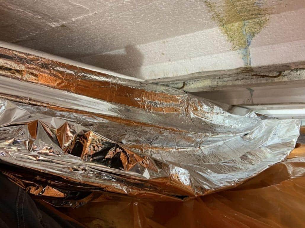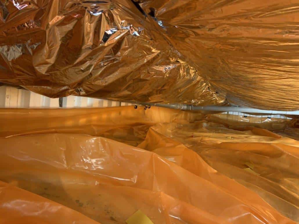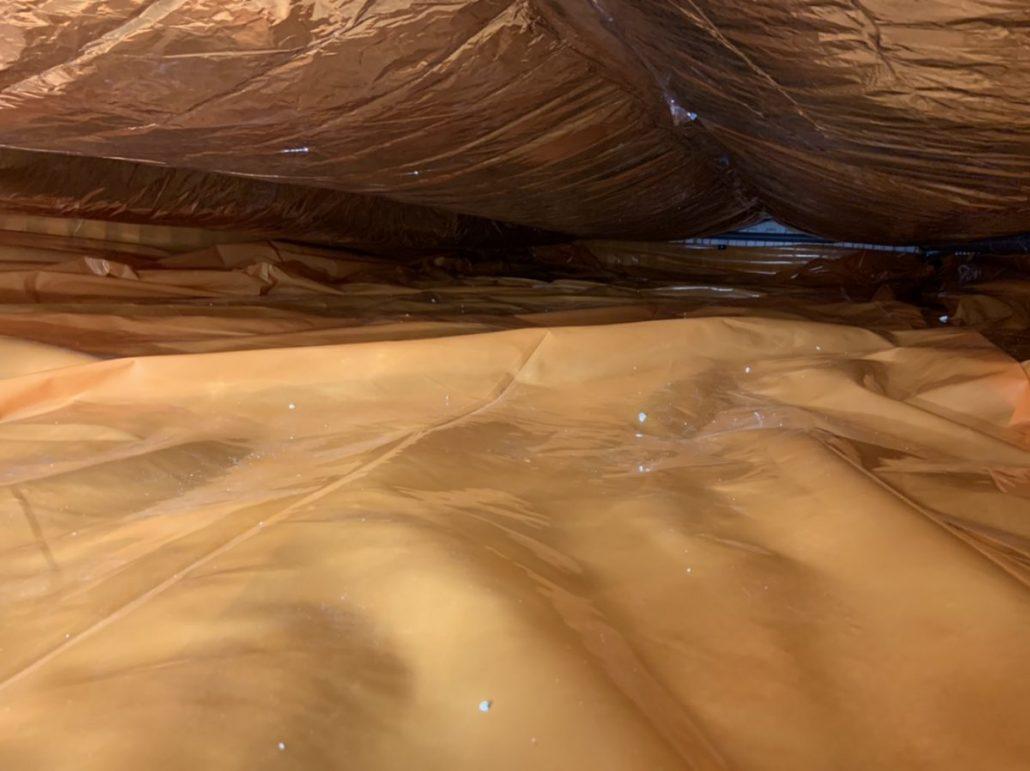 Als eerste fase hebben we voor het optrekkend vocht uit de bodem een laag noppenfolie aangebracht. De tweede fase in deze aanpak bestond uit het aanbrengen van TONZON bodemfolie. De bodemfolie werd over de gehele vloer aangebracht met een hoog opstaande rand tegen de muren. Deze werd machinaal bevestigd zodat we zeker weten dat de folie vastzit. Hierdoor krijgt optrekkend vocht vanuit de bodem geen kans meer.