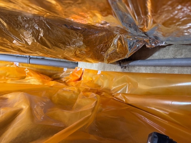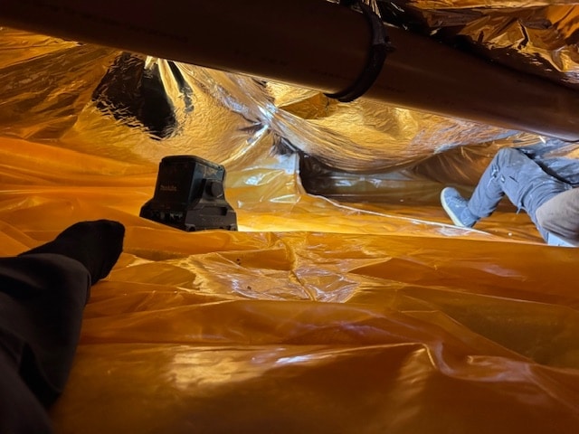 Als eerste fase hebben we voor het optrekkend vocht uit de bodem een laag noppenfolie aangebracht. De tweede fase in deze aanpak bestond uit het aanbrengen van TONZON bodemfolie. De bodemfolie werd over de gehele vloer aangebracht met een hoog opstaande rand tegen de muren. Deze werd machinaal bevestigd zodat we zeker weten dat de folie vastzit. Hierdoor krijgt optrekkend vocht vanuit de bodem geen kans meer.