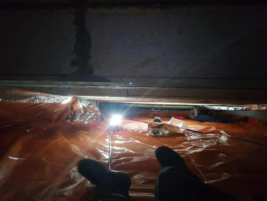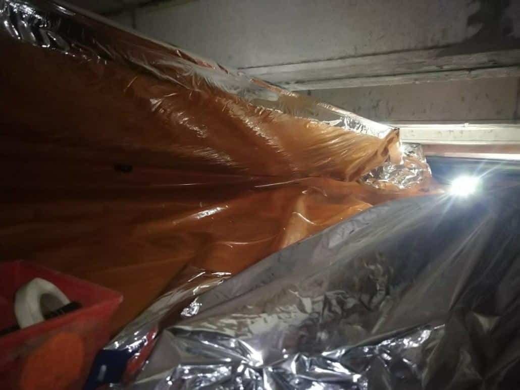 Als eerste fase hebben we voor het optrekkend vocht uit de bodem een laag noppenfolie aangebracht aangebracht in de kruipruimte. De tweede fase in deze aanpak bestond uit het aanbrengen van TONZON bodemfolie. De bodemfolie wordt over de gehele vloer aangebracht met een hoge opstaande rand tegen de muren. Deze wordt machinaal bevestigd zodat we zeker weten dat de folie vastzit. Hierdoor krijgt optrekkend vocht vanuit de bodem geen kans meer.