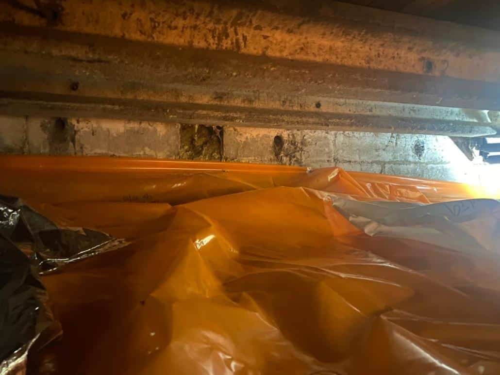 Als eerste fase hebben we voor het optrekkend vocht uit de bodem een laag noppenfolie aangebracht. De tweede fase in deze aanpak bestond uit het aanbrengen van TONZON bodemfolie. De bodemfolie werd over de gehele vloer aangebracht met een hoog opstaande rand tegen de muren. Deze werd machinaal bevestigd zodat we zeker weten dat de folie vastzit. Hierdoor krijgt optrekkend vocht vanuit de bodem geen kans meer.