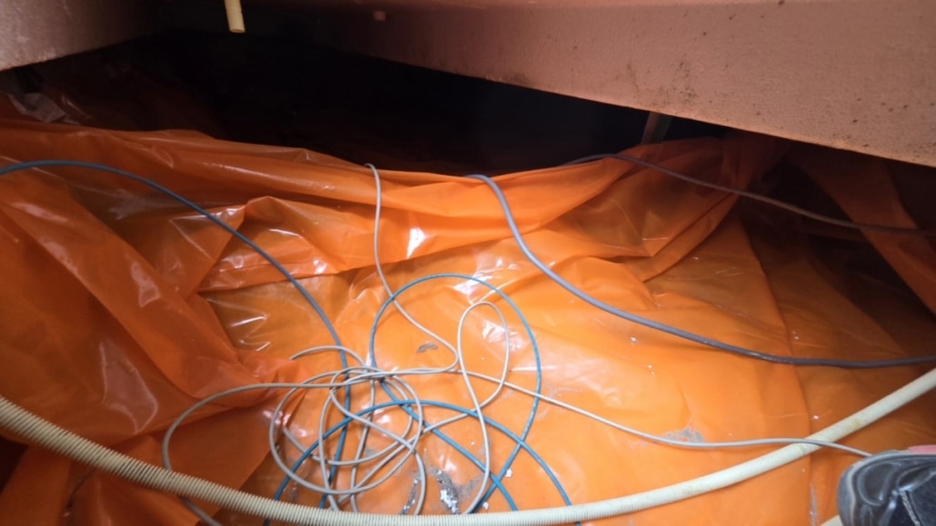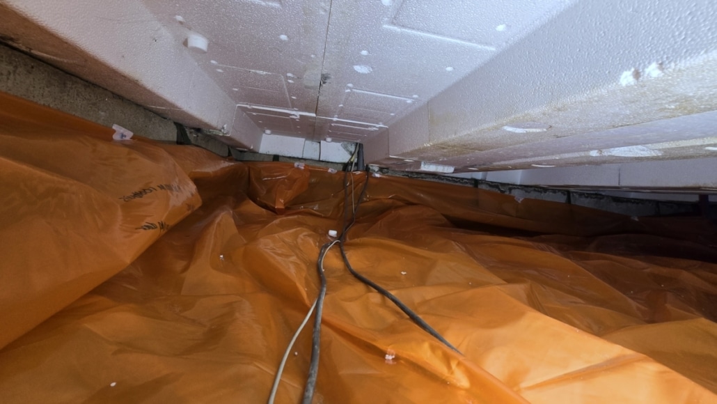 Als eerste fase hebben we voor het optrekkend vocht uit de bodem een laag noppenfolie aangebracht. De tweede fase in deze aanpak bestond uit het aanbrengen van TONZON bodemfolie. De bodemfolie werd over de gehele vloer aangebracht met een hoog opstaande rand tegen de muren. Deze werd machinaal bevestigd zodat we zeker weten dat de folie vastzit. Hierdoor krijgt optrekkend vocht vanuit de bodem geen kans meer.